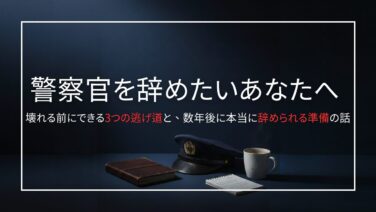 働き方・キャリア警察官を辞めたいあなたへ|壊れる前にできる3つの逃げ道と、数年後に本当に辞められる準備の話 警察官を辞めたいと感じたらどうすべき?パワハラ・適応障害・子育てとの両立…元警察官が「今日できる逃げ道」と数年後に本当に辞められる資産と家計の準備を解説。 2025.12.04働き方・キャリア