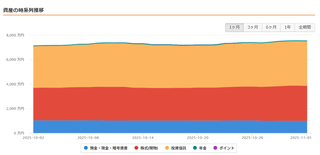 2025年10月末時点での我が家の総資産は、約7,560万円となりました。前月末(約7,130万円)から、約430万円の増加となり、単月としては過去最大級の資産増となりました。