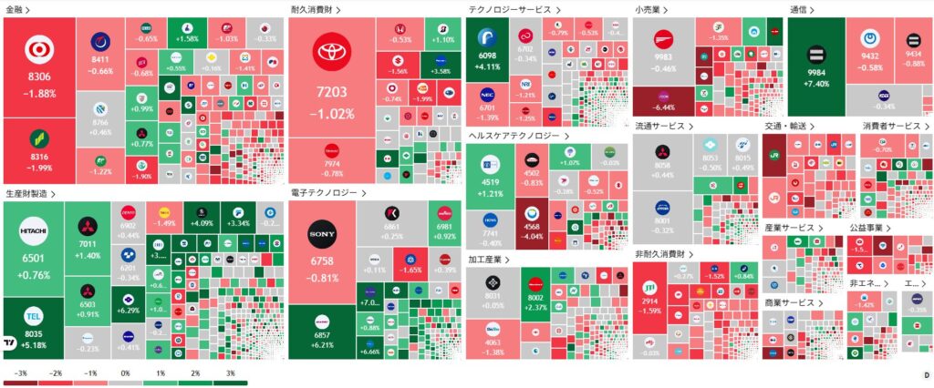 ヒートマップを見るとソフトバンクグループ等の一部銘柄の大幅な上昇が日経平均株価上昇に寄与しているようです。