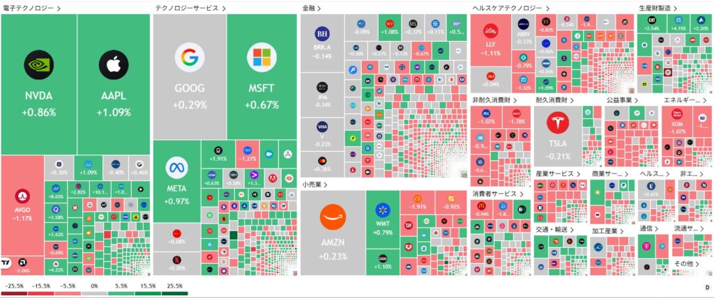 ヒートマップを見ると大型株の小幅な上昇が見てとれます。
